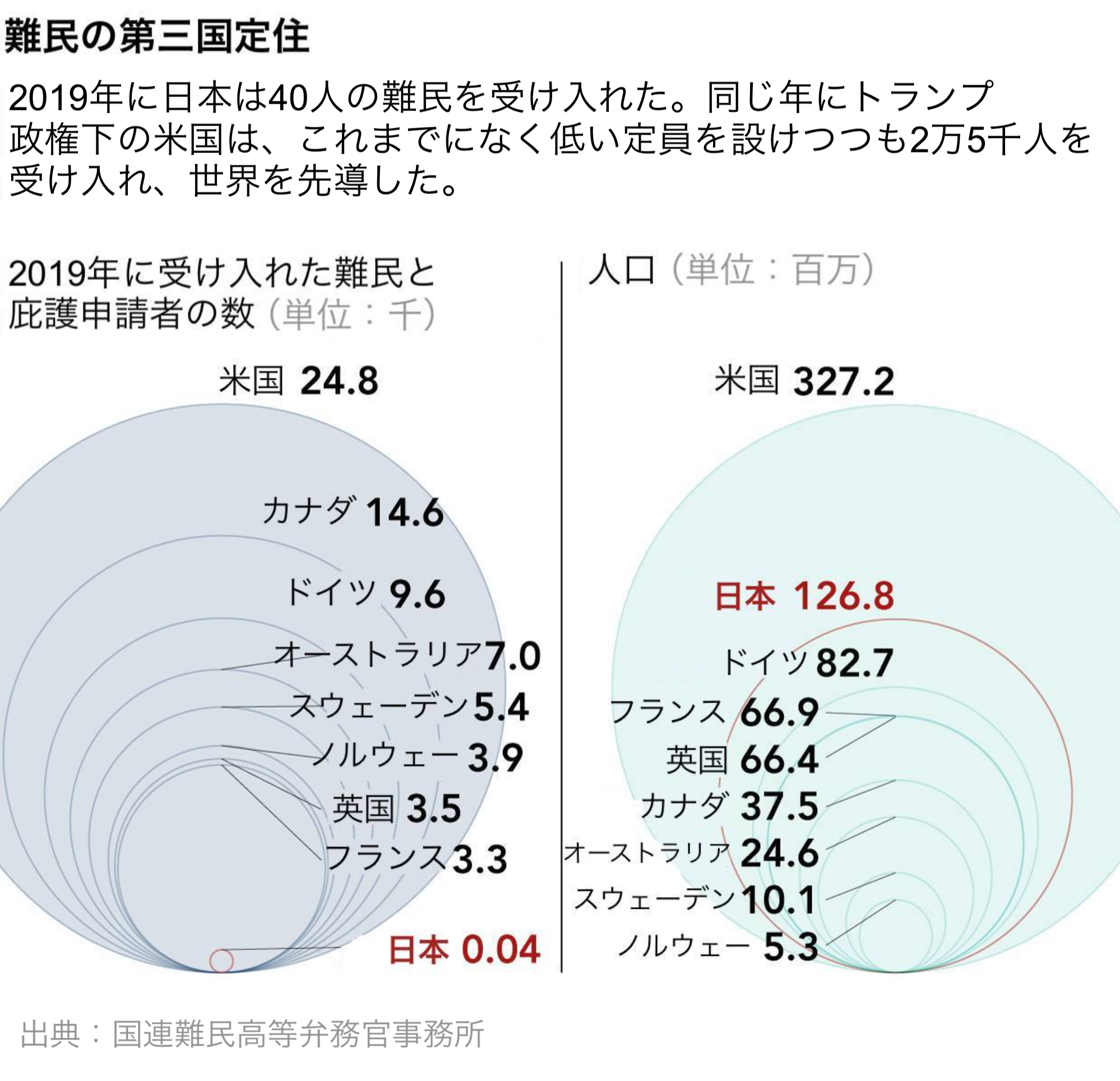 日本はこの国際条約に参加することで、庇護希望者を受け入れ、難民認定を行うことを約束しました。しかし、当初から厳しい移民規制を行っており、難民として受け入れられる庇護希望者の数は明らかに少なくなっています。出入国在留管理庁によると、2024年に難民認定を受けたのは審査された申請者数5,293人の内の約3.33%である176人で、申請者の出身国は多い順にスリランカ、タイ、トルコ、インド、パキスタンでした。2023年に認定されたのは審査された申請者5,334人の5.42%である289人、その前の年は5,605人のうちさらに低い3.34%の187人という数になっています。下の図は、2019年に日本を含めた先進国諸国が受け入れた難民の数と人口を比較したもので、日本の認定率の低さが見て取れます。