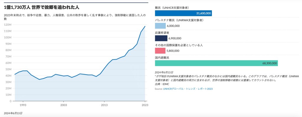 自分の居住地から強制的に移動させられる人々の数は過去30年間でピークに達し、迫害、暴力、国家間の紛争などさまざまな理由で2023年末で合計1億1,730万人が強制移住させられたとUNHCRが報告しています。そのうち、3,160万人が難民として認定されており、690万人は庇護希望者で、おおよそ半分である6,830万人は国内避難民と呼ばれる母国内で居場所を奪われた人々です。また、世界で故郷を追われた人たちの約4割が18歳未満の子どもたちです。世界の難民の75%は中・低所得国で受け入れられています。