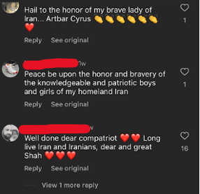 Ariana has faced loneliness in carrying out in-person activism in Japan, but she does not feel alone in this fight with her digital activism. Her almost 10,000 followers on Instagram consist of friends and strangers alike, from whom she receives many comments encouraging and supporting her views and activities on bringing Reza Pahlavi back to Iran. She receives a lot of love on her social media platform, providing her the support she does not receive from Iranian people in Japan.