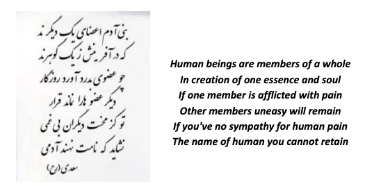 Soft-spoken and soft-hearted Ariana holds dearly to one poem called “Human Beings are Members of a Whole, In Creation of One Essence and Soul” written by a Persian poet, Saadi Shirazi (1210–1291 or 1292). She feels that this poem conveys Ariana’s outlook on her activism: the importance of people being empathetic towards others and working together to bring peace when it is being disturbed.