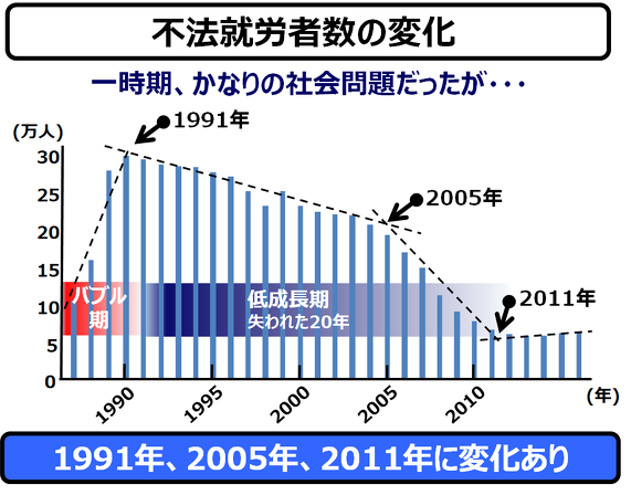 バブル期に日本経済が成長し雇用が増えた一方、いわゆるきつい・汚い・危険な「3K労働」は深刻な人手不足問題を抱えていました。そんな中、知的労働に集中した日本人労働者の代わりに、肉体労働などの「3K労働」を担い日本の産業を支えたのが外国人労働者だったのです。バブル景気最中と崩壊後の人手不足の中、必死な雇用主は就労資格に関わらずこうした外国人労働者に頼り、政府や警察も「安くていつでも切り捨てられる」非正規雇用に目を瞑っていました。