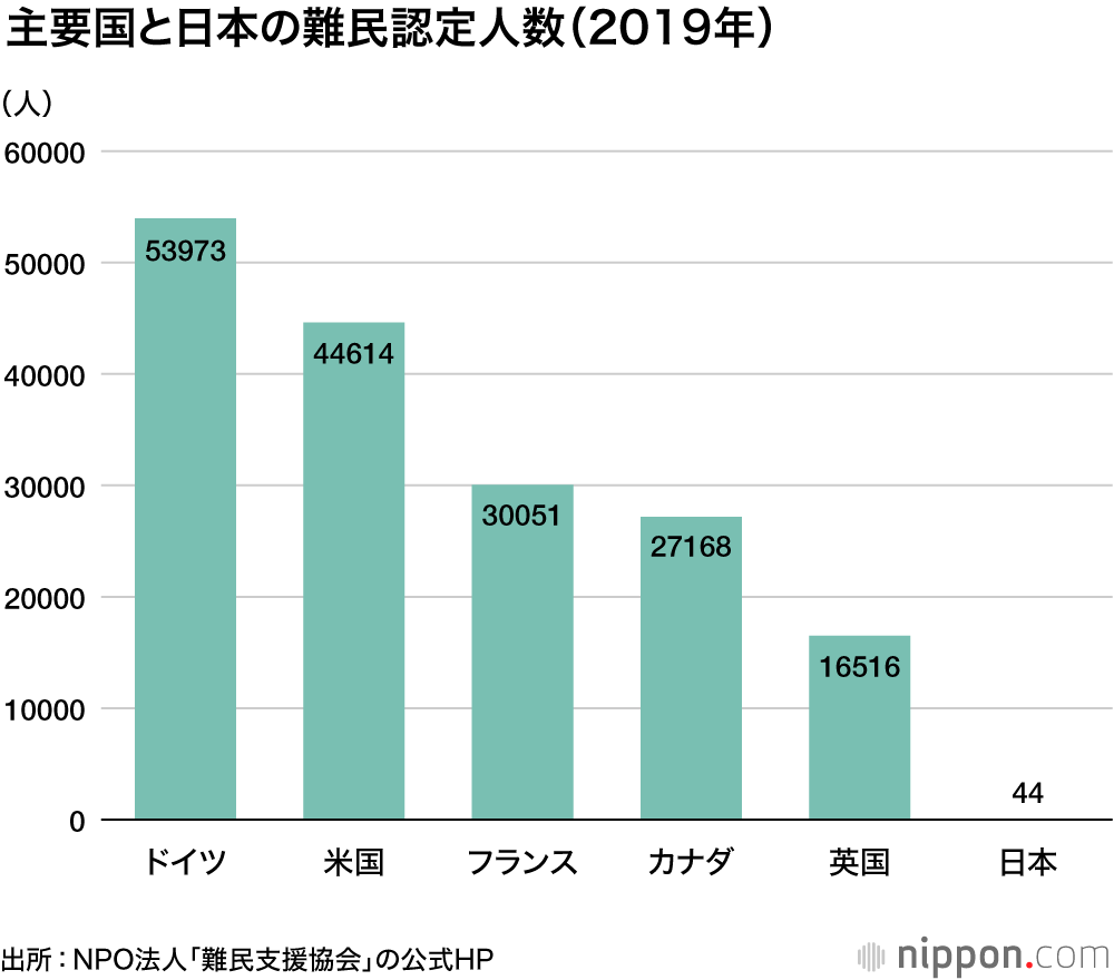 日本は世界で最も難民認定数が少ない国のひとつです。例えば2019年に日本は44人の難民に資格を与えましたが、上のグラフで一目瞭然なように、5桁の数を受け入れている他の経済先進・民主主義国と比べると差が著しいのが現状です。2023年には認定数が303人に達するなど日本でも難民の受け入れが増え始めているとはいえ、世界的に見れば日本の受け入れ率はまだかなり低いままなのです。