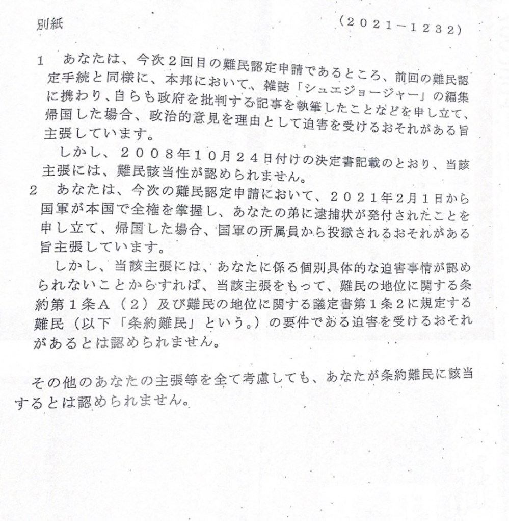 ニョーが来日した1991年当時は、難民条約批准から10年経っていたと言えども国内の制度はまだ発展途中で、公的機関や市民セクターからの働きかけはほとんどありませんでした。そのため、2004年まで自分が難民として認定される権利と機会があることにすら思い至らなかったのです。それからの4年間は不認定の判断に対する不服申し立てに費やされ、その間も非正規の滞在者であり続けるしかありませんでした。そして、2008年に入管に収容されてから2021年に難民認定を再申請するまでの13年間は、本来一時的なものであるはずの仮放免のまま暮らしてきました。この30年間の大半は日本経済に貢献してきたのに関わらず、ニョーは働くことも基本的な医療を受けることもできない「苦しい」生活を送ってきたのです。その間ずっと、愛する妻と家族のいる故郷に戻るという選択肢も、身の安全を考えるとありませんでした。