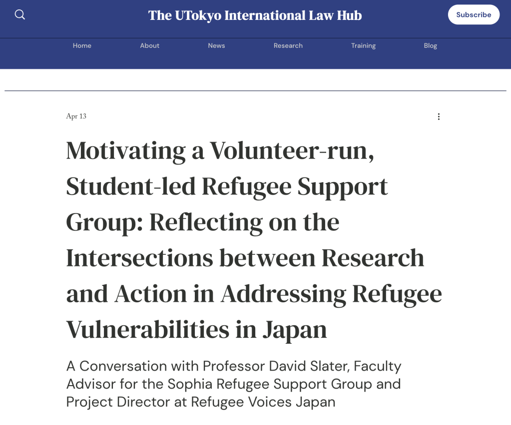 This article by The UTokyo International Law Hub is based on an interview conducted on Professor David Slater, a faculty advisor to SRSG and the Project Director at Refugee Voices Japan. The interview is on the intersections between academic research, refugee advocacy, and the evolution of SRSG. He discusses the strengths and challenges of a student-led model, the role of Refugee Cafés in building trust and community, and the importance of grounding advocacy in research and human rights. The piece highlights how integrating advocacy into learning can both motivate students and create meaningful societal impact for vulnerable refugee communities in Japan.