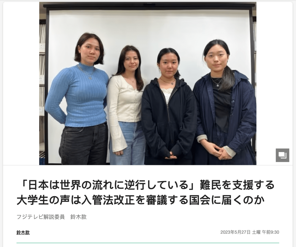 This article, published by FNN Prime Online (Fuji TV), features the multifaceted support activities of SRSG and the perspectives of students regarding Japan’s immigration and detention system. The report provides an in-depth look at the group’s ongoing initiatives since its founding in 2017, including food distribution and visitation programs at immigration detention centers. Through interviews with members, the article highlights the structural challenges faced by youth raised in Japan without legal residency status, as well as concerns regarding the Immigration Control Act amendments in light of international human rights standards. It showcases the students’ proactive commitment to addressing systemic social issues from the front lines of refugee support.