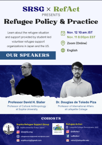 | November 12, 2023 | Organization | RefAct Lafayette College | We co-hosted an online panel discussion addressing the refugee policies and issues in both the United States and Japan with a refugee support group called Refugee Action (RefAct) from Lafayette College in Pennsylvania, United States, with approximately 50 participants. |